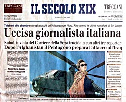 Dear Visitors, these next pages are a heartful tribute to Maria Grazia Cutuli, sweetest friend, valued travelmate and skillful writer for Corriere della Sera, major italian newspaper, who was ambushed and killed by unknown assailants on November 19 2001, while traveling from Jalalabad to Kabul (Afghanistan) together with colleagues Julio Fuentes (spanish newspaper El Mundo), Harry Burton and Hazizullah Haidari (cameraman and photographer, Reuters).